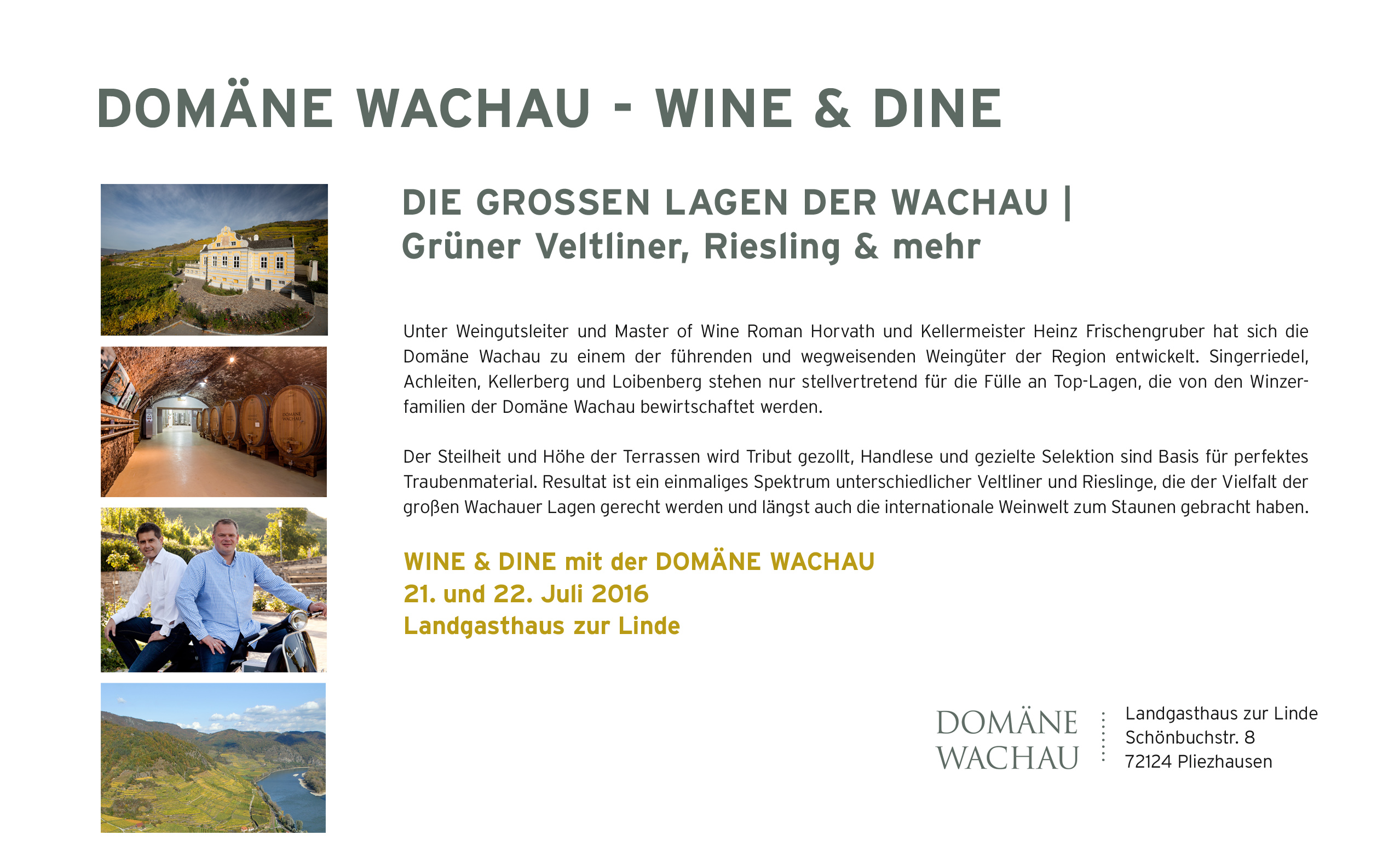 An diesem Abend servieren wir Ihnen ein perfekt auf die Weine abgestimmtes 4-Gang-Menü, inklusive aller Getränke zum Preis von 125,- Euro pro Person.